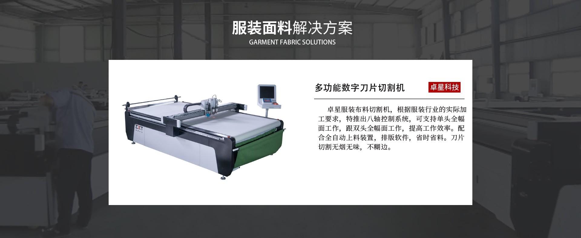 卓星服裝布料切割機,根據服裝行業的實際加工要求,特推出八軸控制系統,可支持單頭全幅面工作,跟雙頭全幅面工作,提高工作效率。配合全自動上料裝置,排版軟件,省時省料。刀片切割無煙無味,不糊邊。